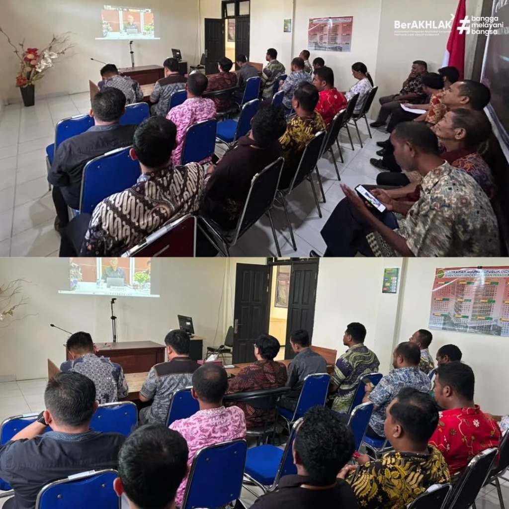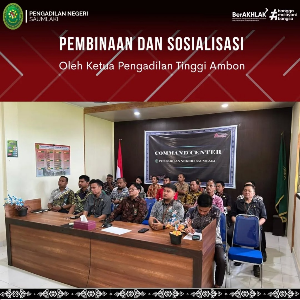Bertempat di Ruang Command Center Pengadilan Negeri Saumlaki, Para Hakim, Panitera, Sekretaris, Pejabat Struktural & Fungsional, serta seluruh staf pelaksana mengikuti kegiatan pembinaan dan sosialisasi oleh Ketua Pengadilan Tinggi Ambon kepada seluruh Pengadilan Negeri yang berada di wilayah hukum Pengadilan Tinggi Ambon secara daring.