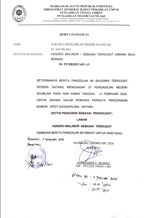 Ditujukan kepada Hedro Malindir Sebagai tergugat dimana saja berada